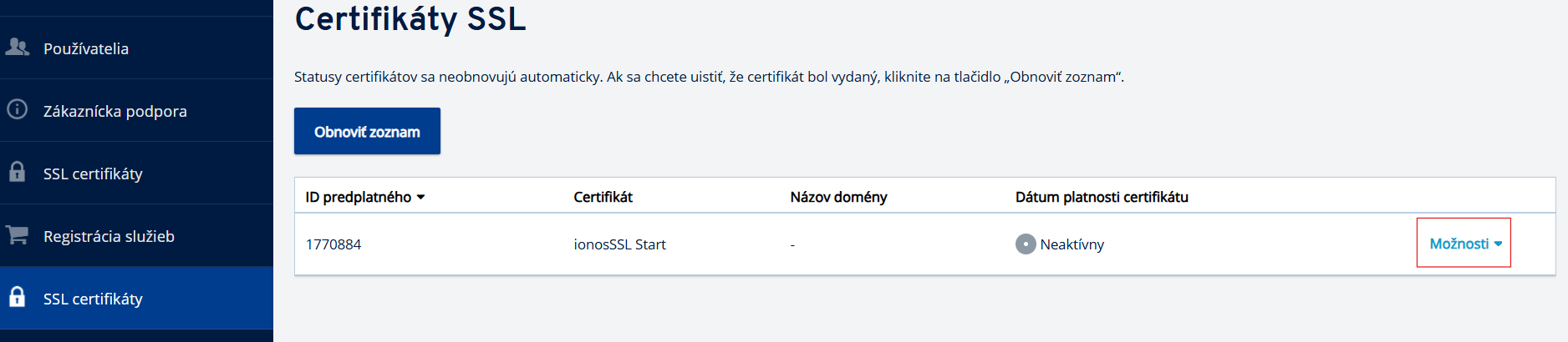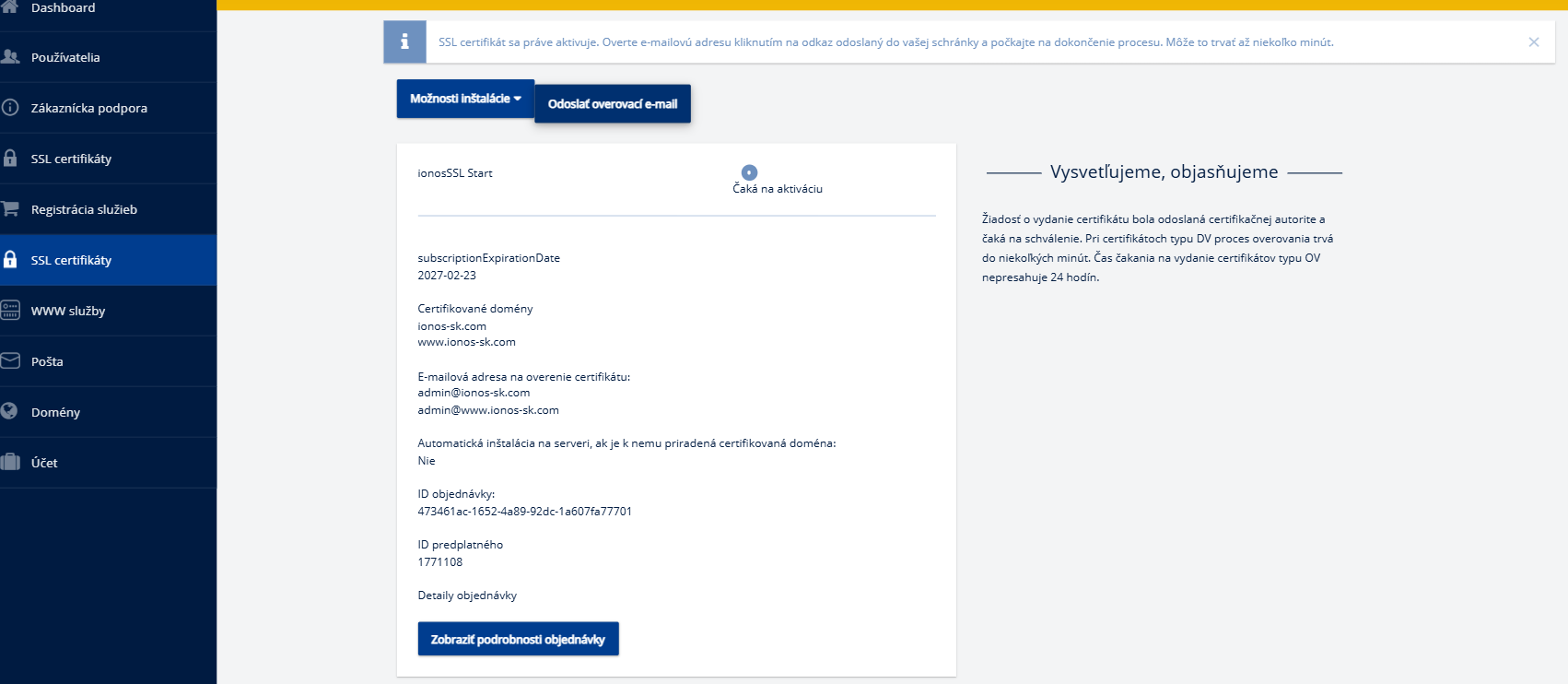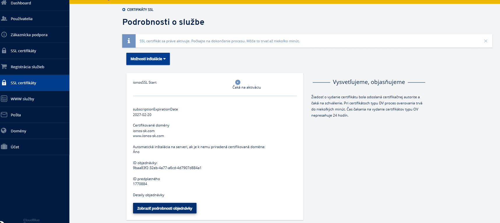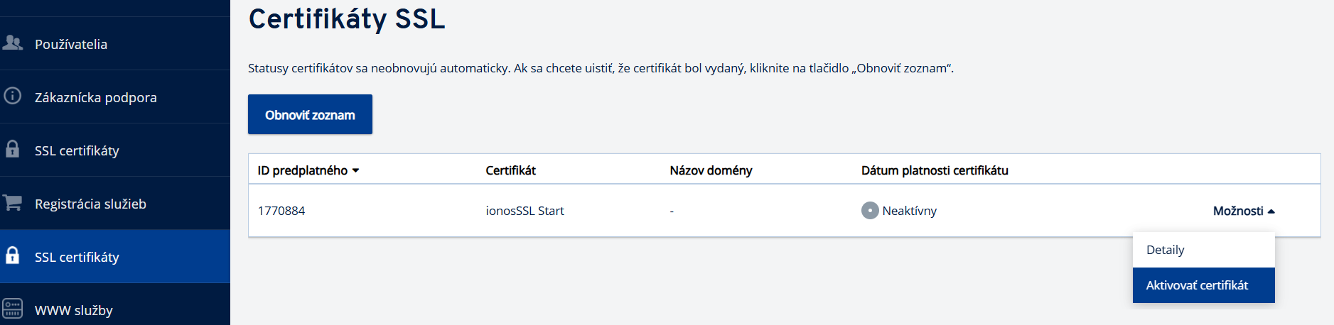 - Aktivácia uhradeného SSL certifikátu v Zákazníckom paneli ionos.sk