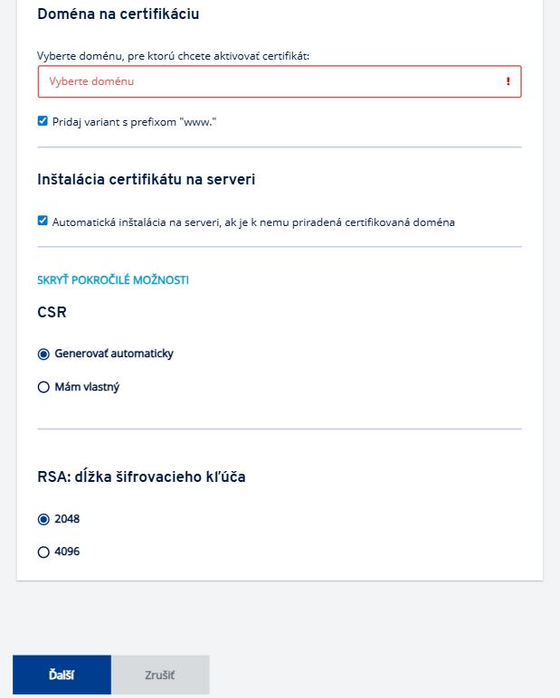- Vyplňte zobrazený formulár aktivácie SSL certifikátu.