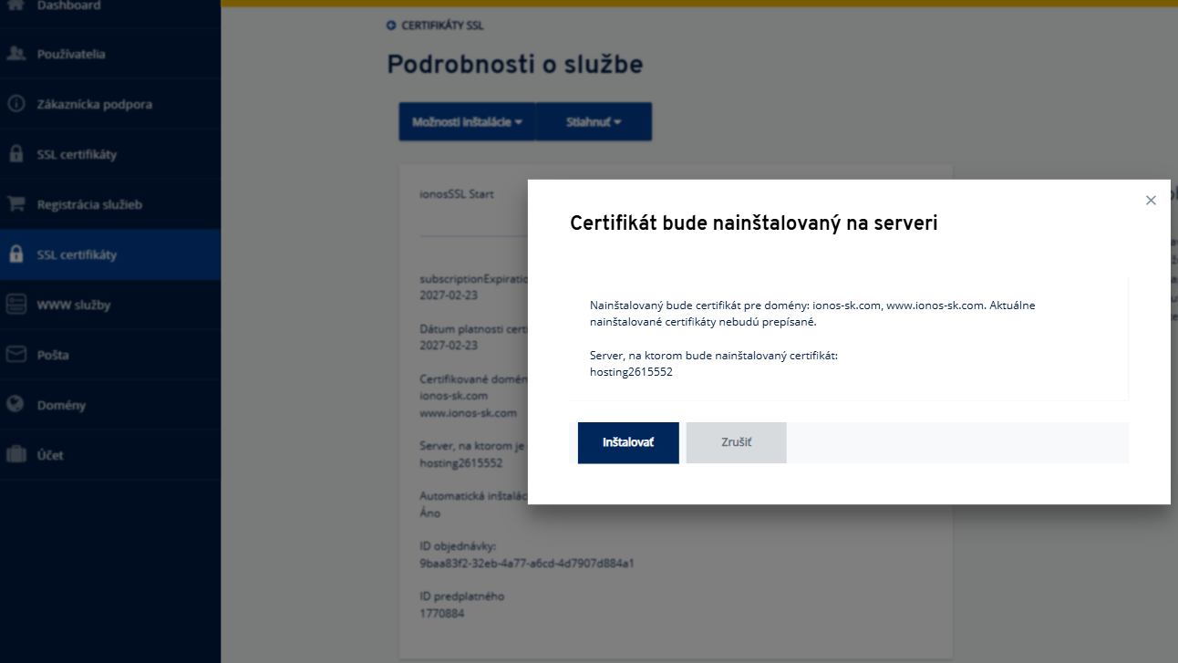 Potvrdenie a inštalácia certifikátu pre domény zo Zákazníckeho panela ionos.sk